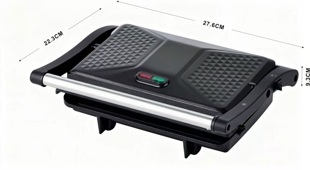 | Key Features | Ultra-portable (1.5kg, 276*223*93mm), Non-stick coating plate, Floating hinge system, 180° open grill mode, Cool-touch safe handle, Oil drip design, Power on & ready lights |